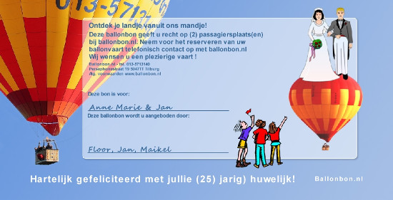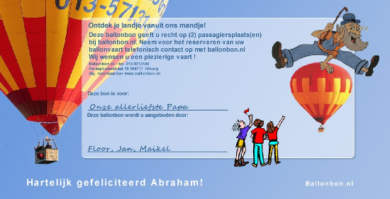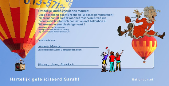 Is de ballonvaart ter gelegenheid van een mooie gebeurtenis of gewoon zomaar? Je kunt kiezen uit verschillende thema’s: Hartelijke gefeliciteerd-, Abraham-, Sarah-, Huwelijks-, Jubileum -, Pensioen man-, Pensioen vrouw-, Geslaagd-, Vaderdag-, Moederdag-, en standaardcadeaubonnen.