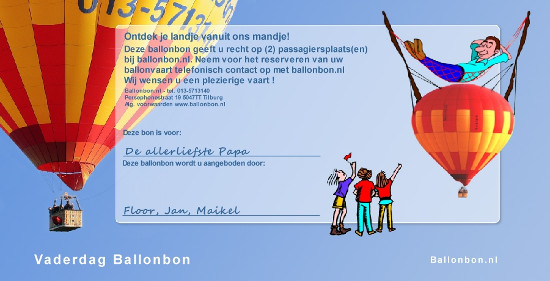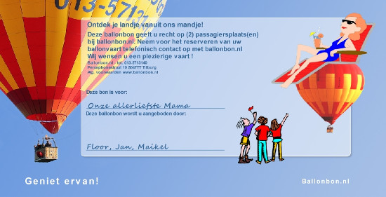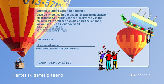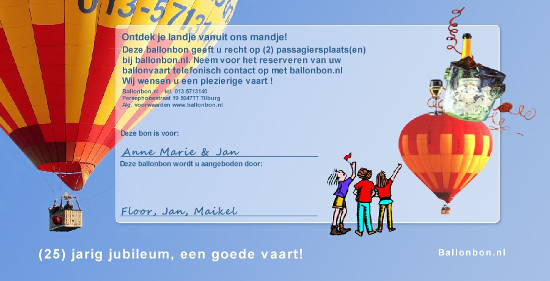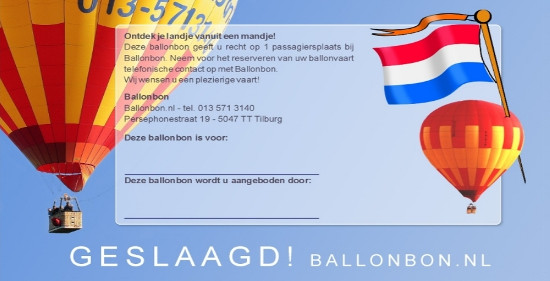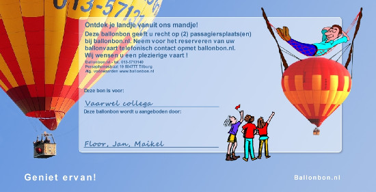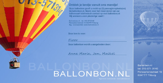 Je kunt een cadeaubon geven vanaf één passagier. De ontvanger van de cadeaubon heeft de keuze om op te stijgen vanaf één van onze standaard opstijglocaties. Ook is het mogelijk om een privé ballonvaart cadeau te geven. Dit kan vanaf twee passagiers waarbij er de keuzemogelijkheid is uit zijn of haar eigen woonplaats of uit één van onze opstijglocaties.